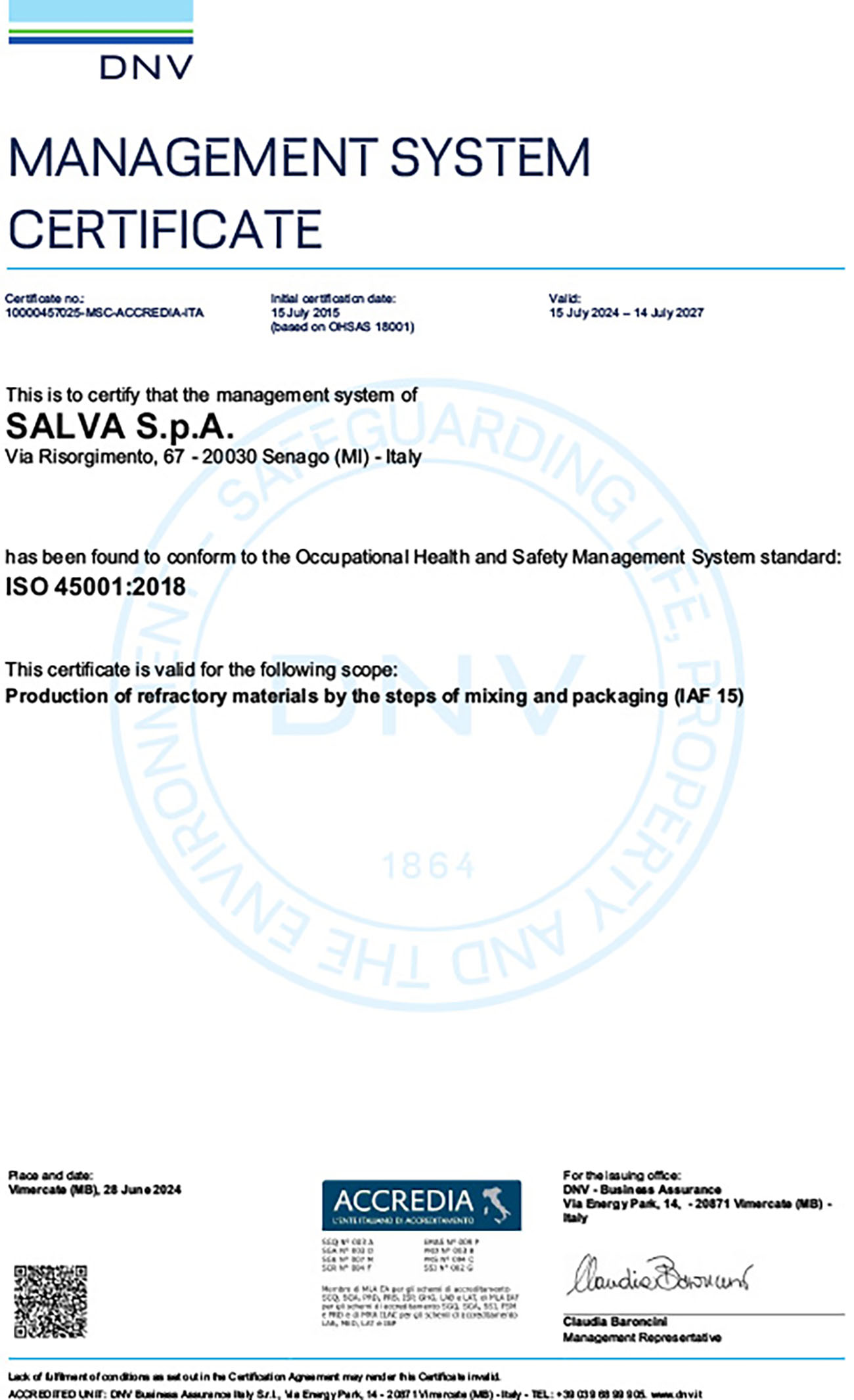 SALVA S.p.A. has obtained compliance with the requirements of the standard for the Management System relating to the Production of refractory materials through the mixing and packaging phases (IAF 15).
